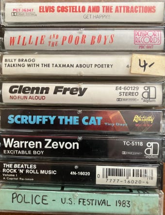 I kept Glenn Frey’s first solo album from 1982, No Fun Aloud, a record he put out following the collapse of the Eagles. No Fun Aloud is actually a great album harkening back to some of Frey’s soulful Detroit influences with songs like “The One You Love” and “I Found Somebody”, but also has some great rockers like “Partytown” and “I’ve Been Born Again” as well as the Eagles-like song “She Can’t Let Go”. Saving this Glenn Frey tape was probably a good call as it is now almost impossible to find in any format that isn’t digital. I also held onto my Willie and the Poor Boys cassette, a throwback band put together during the mid-1980s consisting of Billy Wyman, Ronnie Wood, and Charlie Watts from the Rolling Stones, Jimmy Page from Led Zeppelin, Dire Straits drummer Terry Williams, and lead singer Paul Rogers from Bad Company. Originally formed to assist former Faces guitarist Ronnie Lane in his battle with Multiple Sclerosis, the group released an album of rock and roll classics including “Sugar Bee”, “Chicken Shack Boogie”, and Otis Redding’s “These Arms of Mine” to raise both funds and awareness. I kept Elvis Costello’s Get Happy, although it is not technically one of my favorite Costello records. In the case of this cassette, I wish I had saved his Trust album instead. According to critics, however, Get Happy is widely regarded as one of Elvis Costello’s best albums. I still have Warren Zevon’s Excitable Boy cassette from 1978 with the songs “Send Lawyers Guns and Money”, “Tenderness on the Block”, and “Werewolves of London”. Not only am I happy that I held onto this tape with Warren Zevon continuing to gain notoriety as a songwriter in the years since his passing, but I’m also relatively sure that the cassette originally belonged to old friend, Maura Mulcahy, who could very well ask for it back someday. I have an early Brian Setzer solo album from 1988, Live Nude Guitars, the second record he did after the breakup of The Stray Cats featuring Setzer’s Eddie Cochran-inspired guitar playing on songs like “Rebelene” and a cover of the Cochran song, “Nervous Breakdown”. I held onto Rock and Roll Volumes I and II by the Beatles which feature early covers like “Kansas City” and “Roll Over Beethoven” on Volume I and “Drive My Car”, “Back in the U.S.S.R.”, and “Hey Bulldog” on the second tape. I kept my rare promotional copy of Billy Bragg’s Talking with the Taxman about Poetry featuring the song “Greetings to the New Brunette”, a tape that I purchased at Looney Tunes on Boylston Street in Boston for $4 according to the price sticker that is still on the case. I kept Boston band Scruffy the Cat’s Tiny Days cassette with Charlie Chesterman fronting the band for their local hit, “My Baby She’s Alright”. There is a bootleg cassette that I bought from a sidewalk vendor at the corner of Mass. Ave and Newbury Street in Boston, The Police playing the 1983 U.S. Festival in California. In the spirit of the times I also saved a few mixtapes including one I put together in 1987 that includes a set of unreleased demos from Boston musician Digney Fignus, songs that I was given access to while working as one of his roadies during the mid-1980s. I also saved a mixtape that I recorded at a friend’s beach house in Hull, Massachusetts, which features the music of several Boston bands like Barrence Whitfield and the Savages, O Positive, and Farrenheit, but also includes classic old recordings taken from original 45s by Elvis Presley, Chuck Berry, and Jerry Lee Lewis. I saved a cassette with a recording from legendary Boston radio station WBCN featuring Chris Difford and Glenn Tilbrook of the band Squeeze interviewed by DJ Ken Shelton during which the pair performed live in the studio to promote their show at the Paradise Rock Club during the summer of 1991. I held onto a similar recording from May 15, 1989, featuring an acoustic appearance by the band XTC on WBCN promoting their album, Oranges and Lemons.